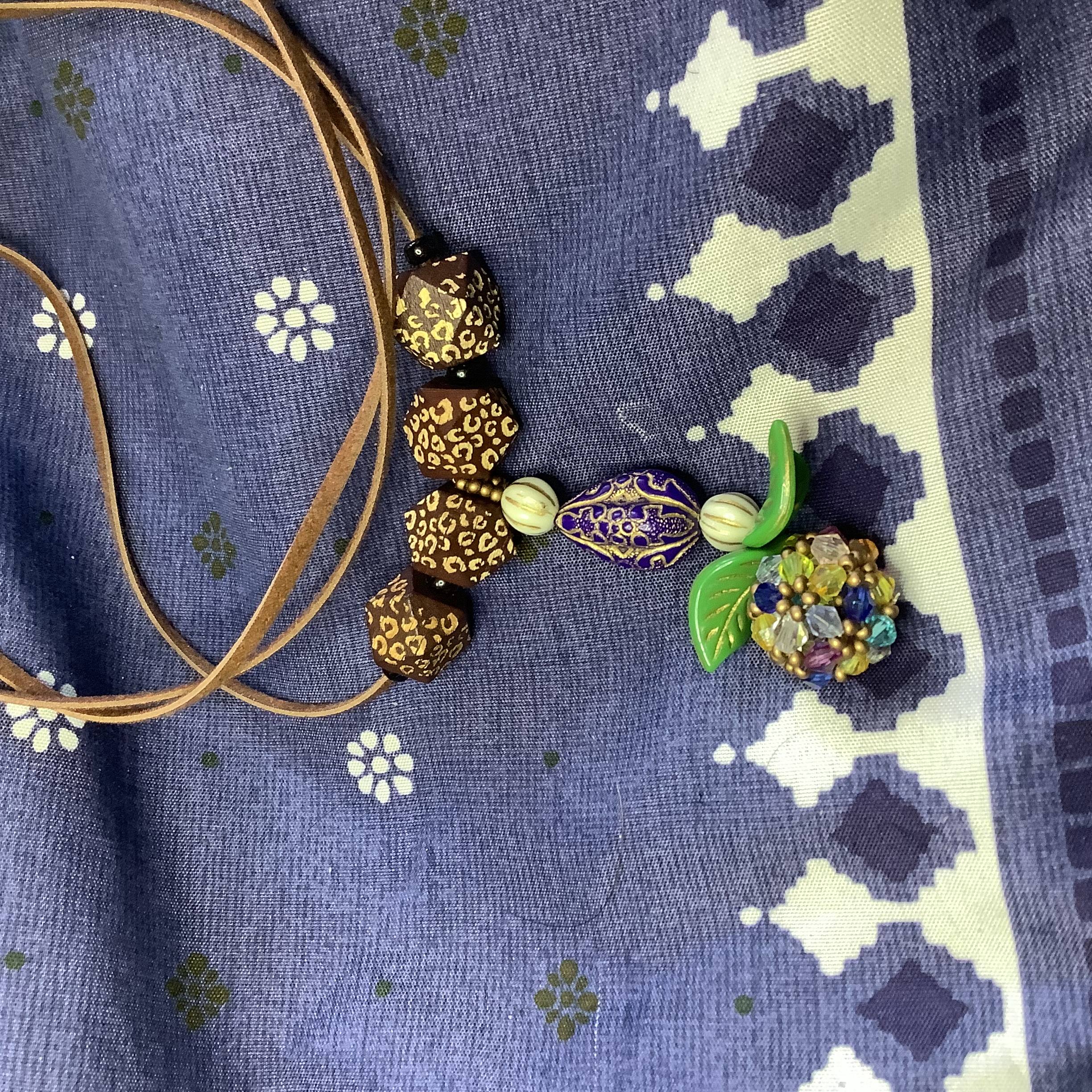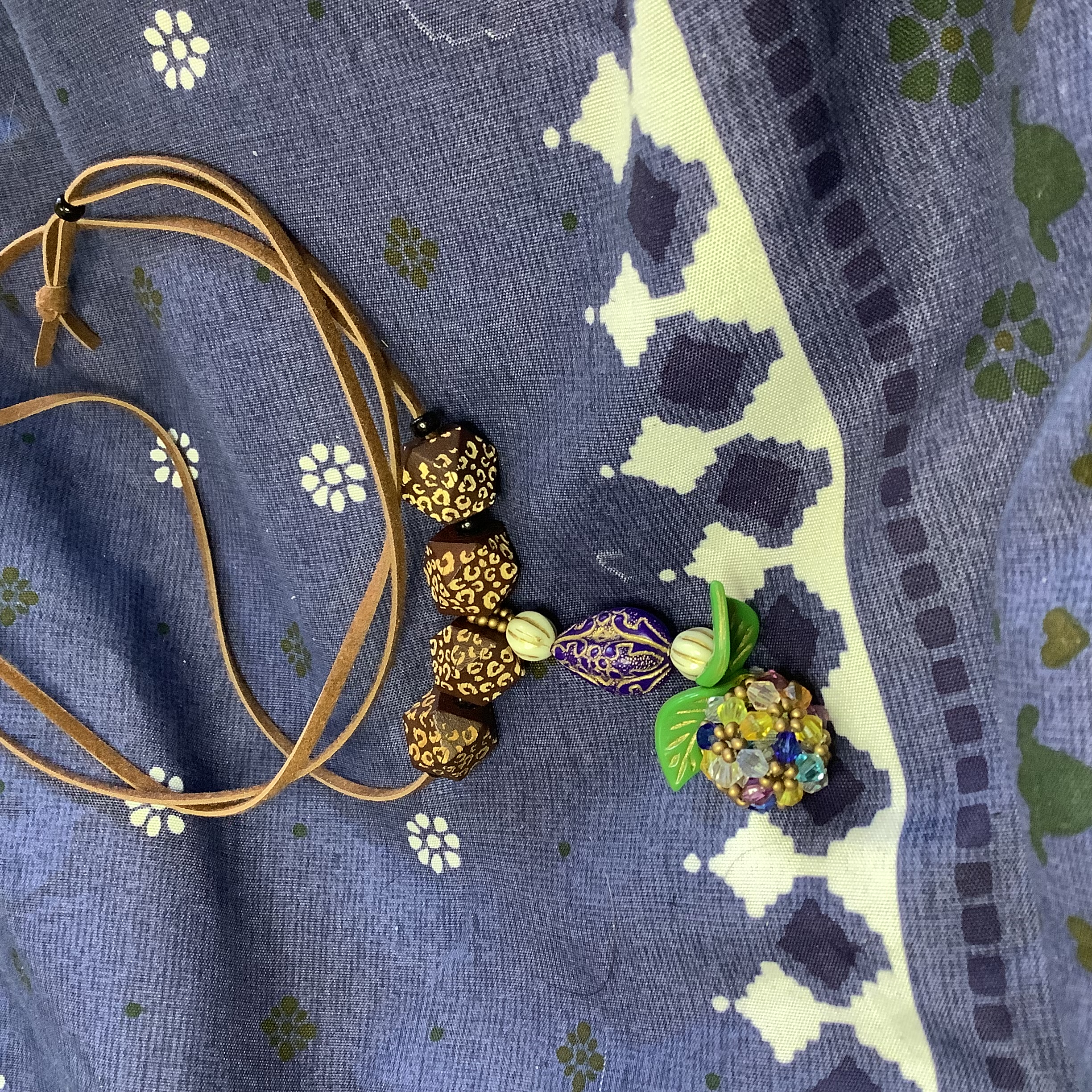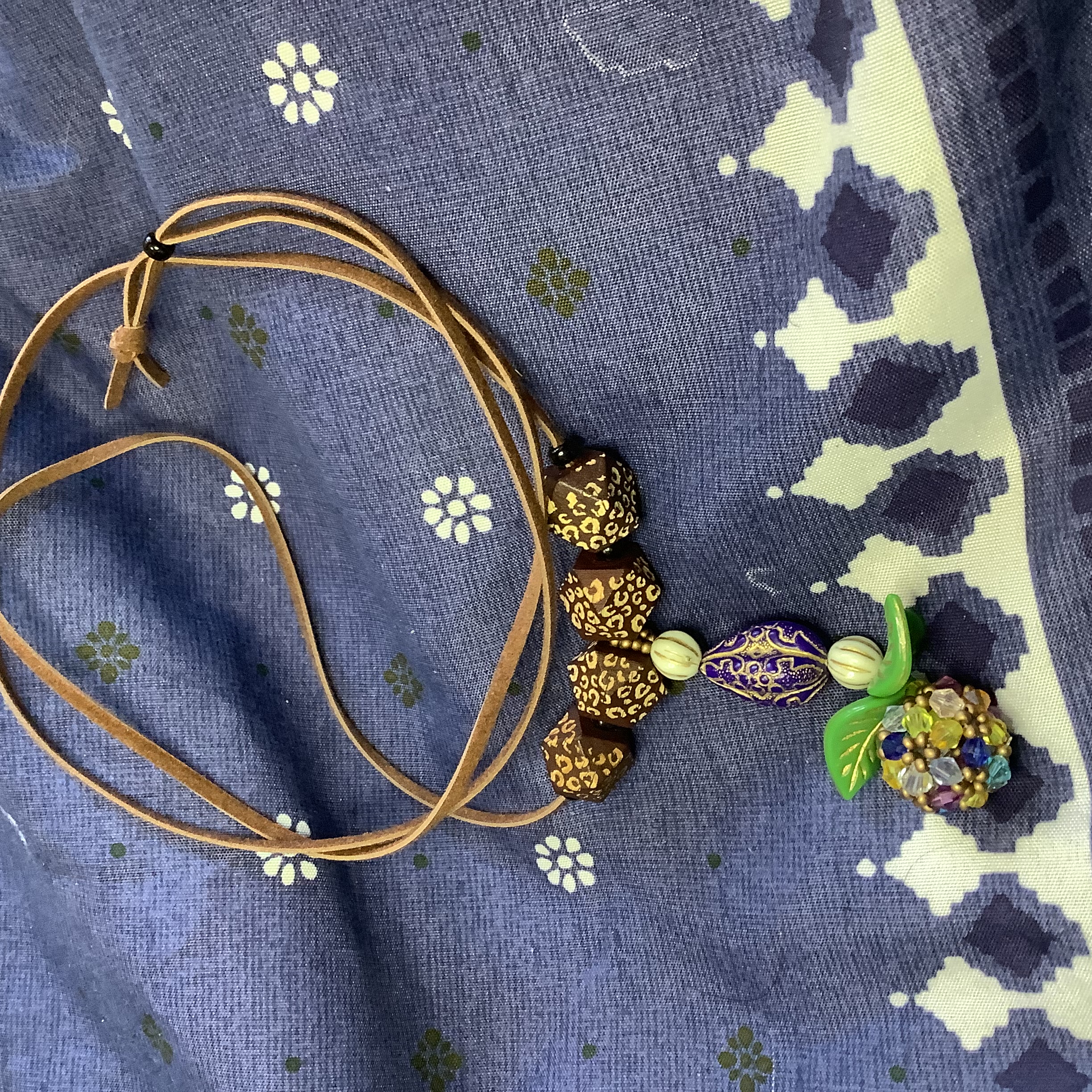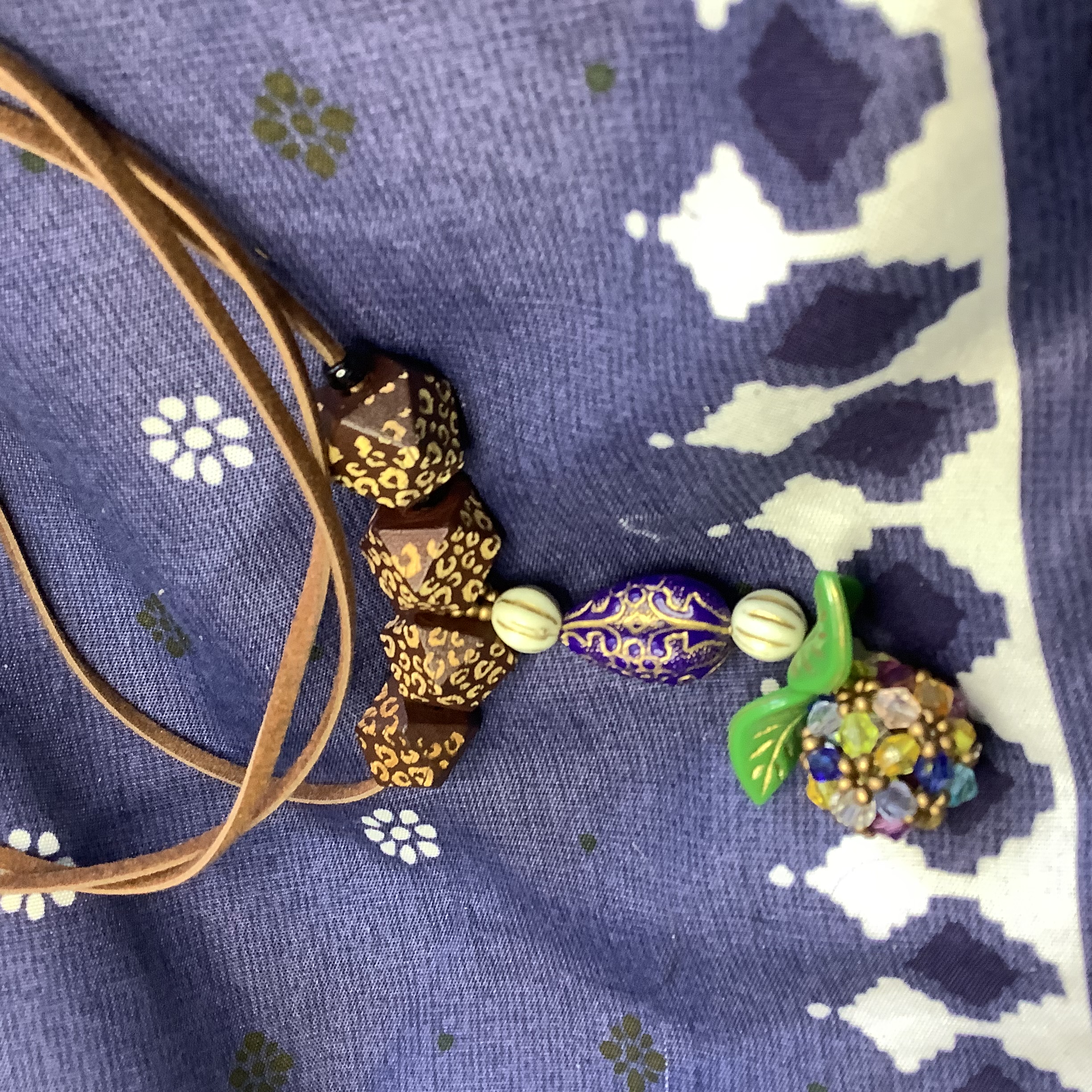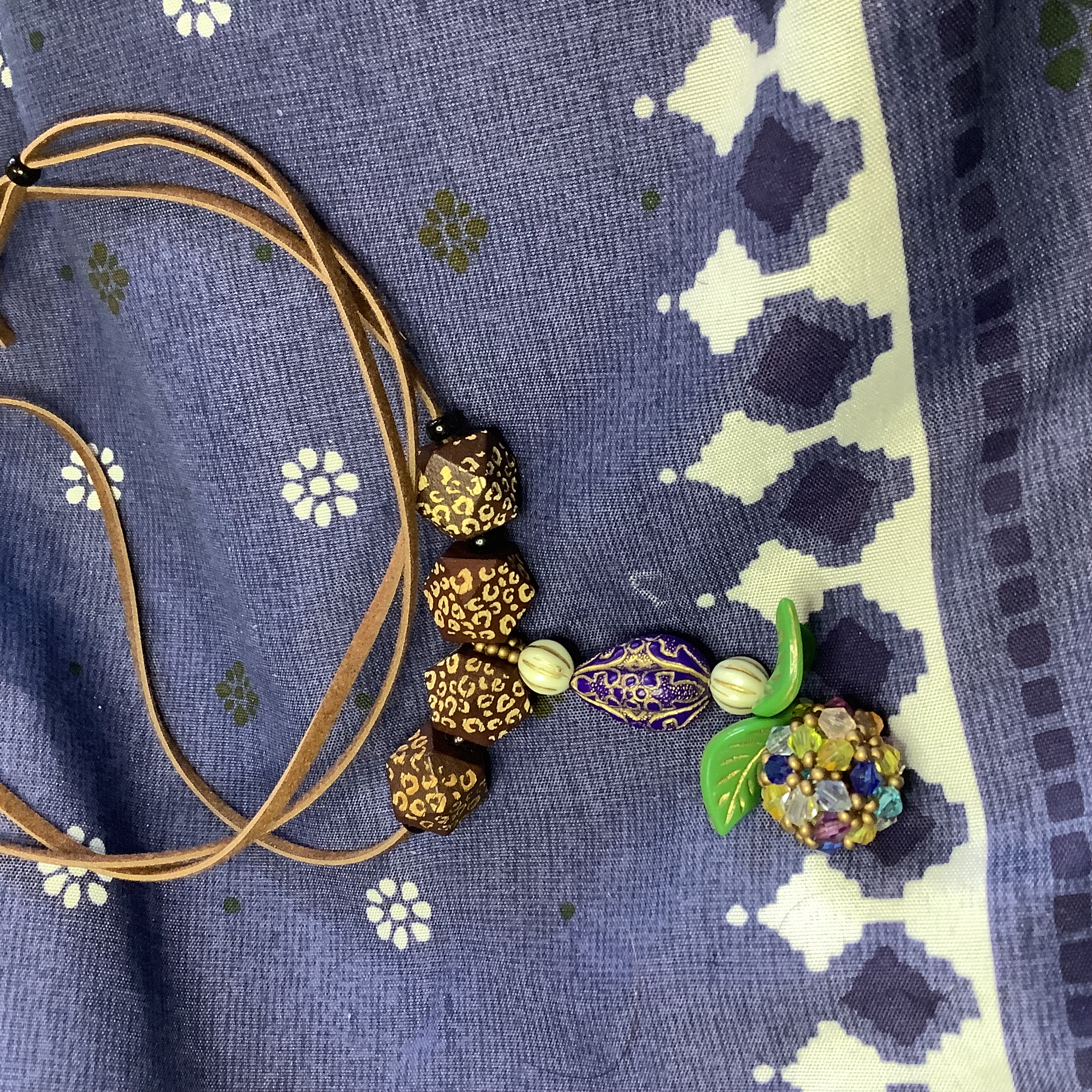 一本糸で編まれたビーズドームは開運のアクセサリーとして生を受け、革紐に通され、ビーズの留め具と豹柄のビーズで飾られ、大粒のペンダントを形成。トレーナーやパーカーの上に出してもほど良い風合いのアイテムは、上品に胸元を飾る。1M程度の紐をつけてお届け。