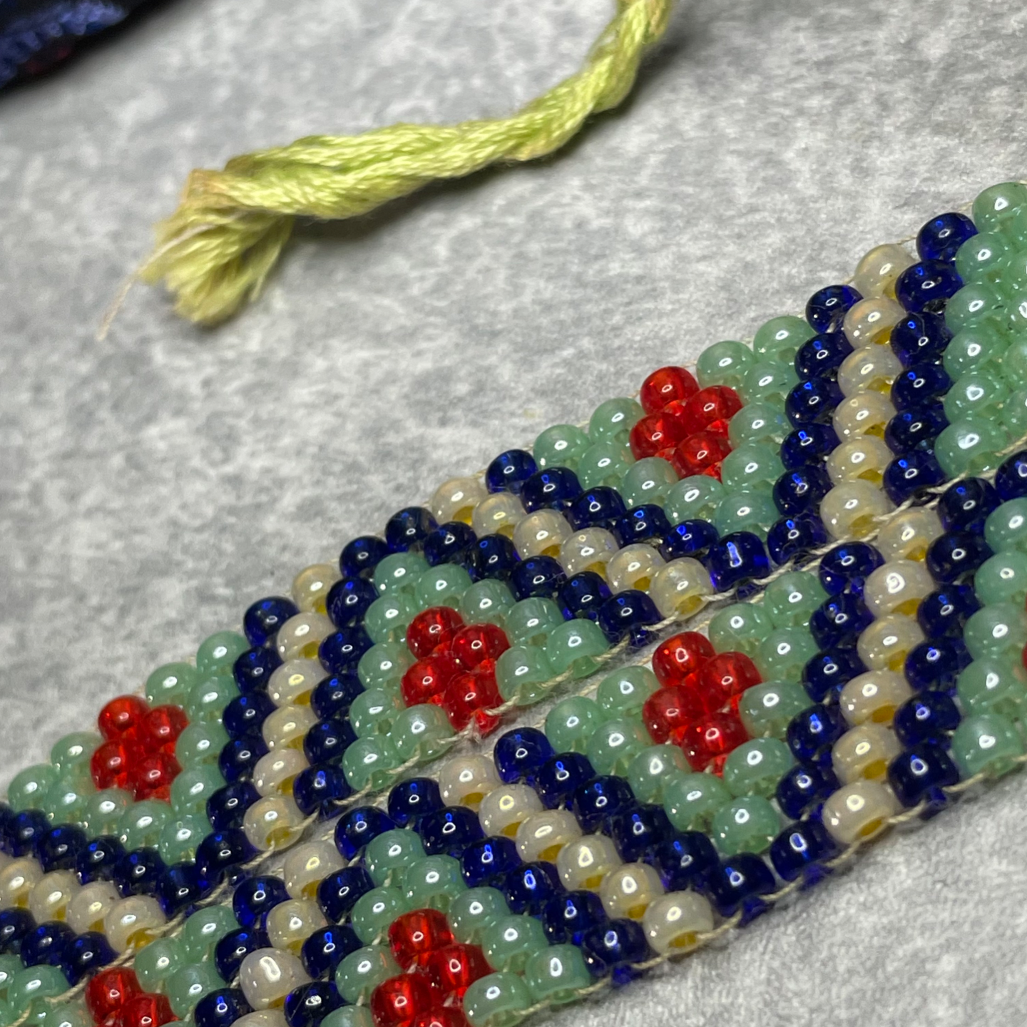 身につけて、切れるまでつけると願いが叶うとされているプロミスリング・ミサンガは、一本糸で編まれ、綺麗な糸で飾った逸品。緑を基調にネイビー・赤・アイボリーと綺麗な色合いを誇る約束としての願いをうちに秘める開運の作品。完全オリジナルの一点もの。